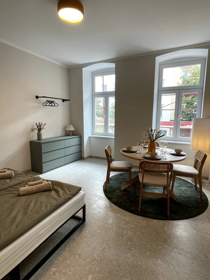 Welcome to Residence K, an elegant boutique residence located in a beautifully renovated Viennese townhouse on Koppstraße. Each studio combines timeless architecture, warm materials, and modern comfort to create a calm, stylish retreat in the city. Discover Residence K, where classical Viennese architecture meets contemporary boutique design. This spacious two-room apartment offers living comfort with soul – warm colours, elegant furniture, and a peaceful ambiance that invites you to relax. The apartment features: A separate bedroom with a premium double bed A stylish living room with a king size bed A fully equipped kitchen (coffee machine, kettle, cookware, etc.) An elegant bathroom with walk-in shower and refined details Ideal for couples, families, business guests, and long-term stays who value design, comfort, and authenticity. Enjoy the beauty of Vienna from your private boutique apartment — at Residence K.